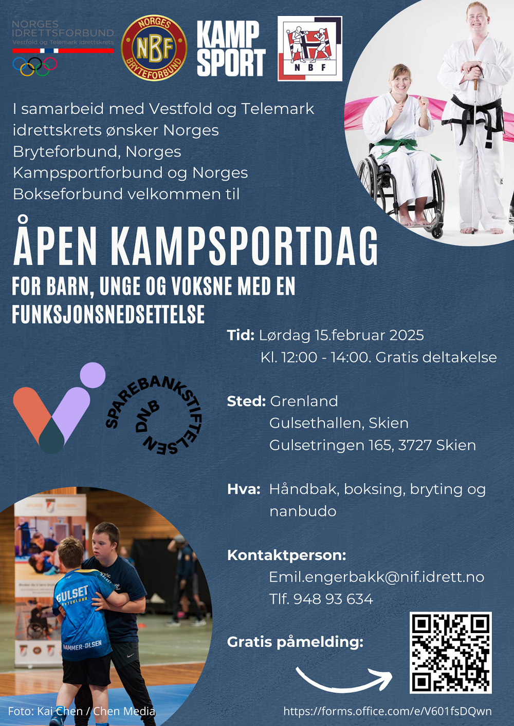 I samarbeid med Vestfold og Telemark idrettskrets ønsker Norges Bokseforbund, Norges Kampsportforbund og Norges Bryteforbund velkommen til åpen kampsportdag. Lokale idrettslag og representant fra forbund vil stille med idretter som bryting, håndbak, boksing og nanbudo.