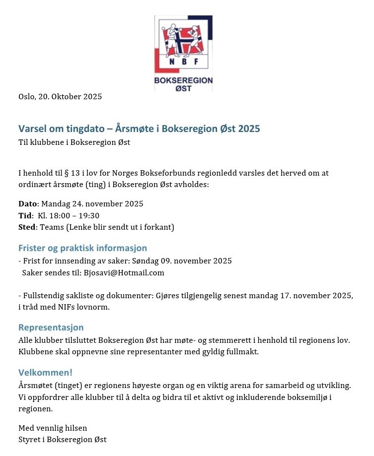 Årsmøte Bokseregion Øst, mandag 24. november 2025 Publisert: tirsdag 21. oktober 2025 Frist for innsending av saker er søndag 9. november 2025 (send til Bjørn Saavik: bjosavi@hotmail.com ) Vi treffes på møtet https://www.facebook.com/groups/3641939419354992/