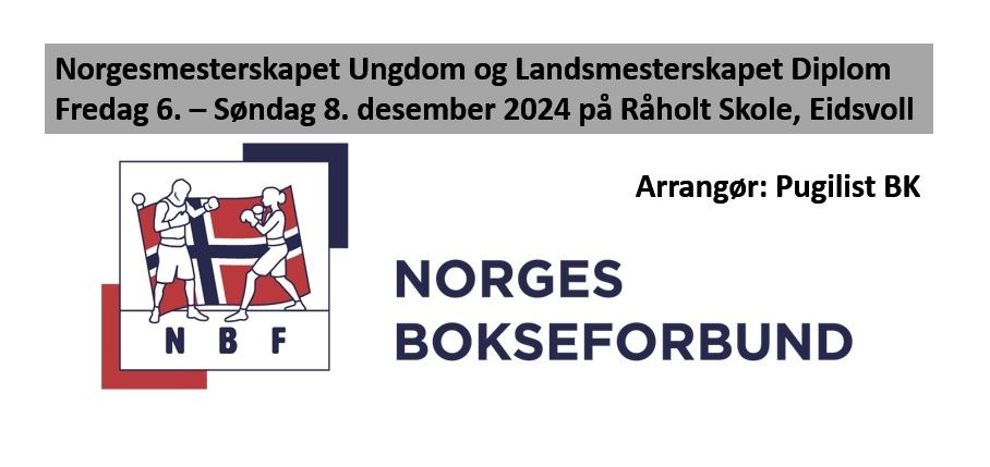 Norges Bokseforbund inviterer i samarbeid med teknisk arrangør Pugilist Bokseklubb til Norgesmesterskapet for ungdomsboksere som avholdes på Råholt Skole, Martin Johansens veg 85, 2070 Råholt (LINK)